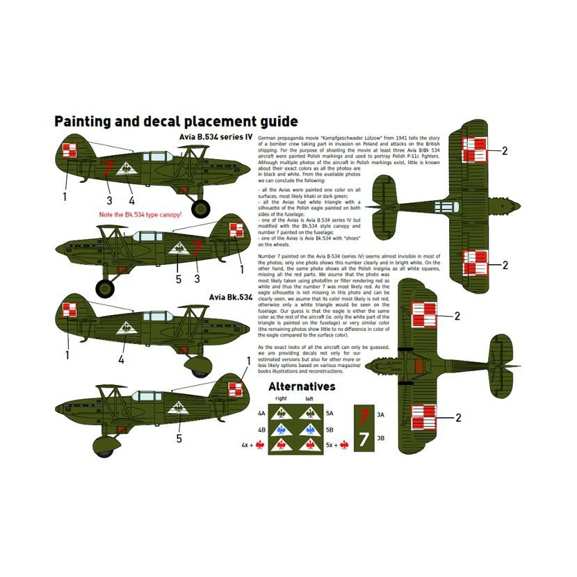 Během natáčení německého propagandistického válečného filmu Kampfgeschwader Lützow byly v roli polských stíhaček použity kořistní stroje Avia B-534 IV. série a Bk-534. Obtisková sada umožňuje postavit jeden model a nabízí výběr dvou možných strojů.
