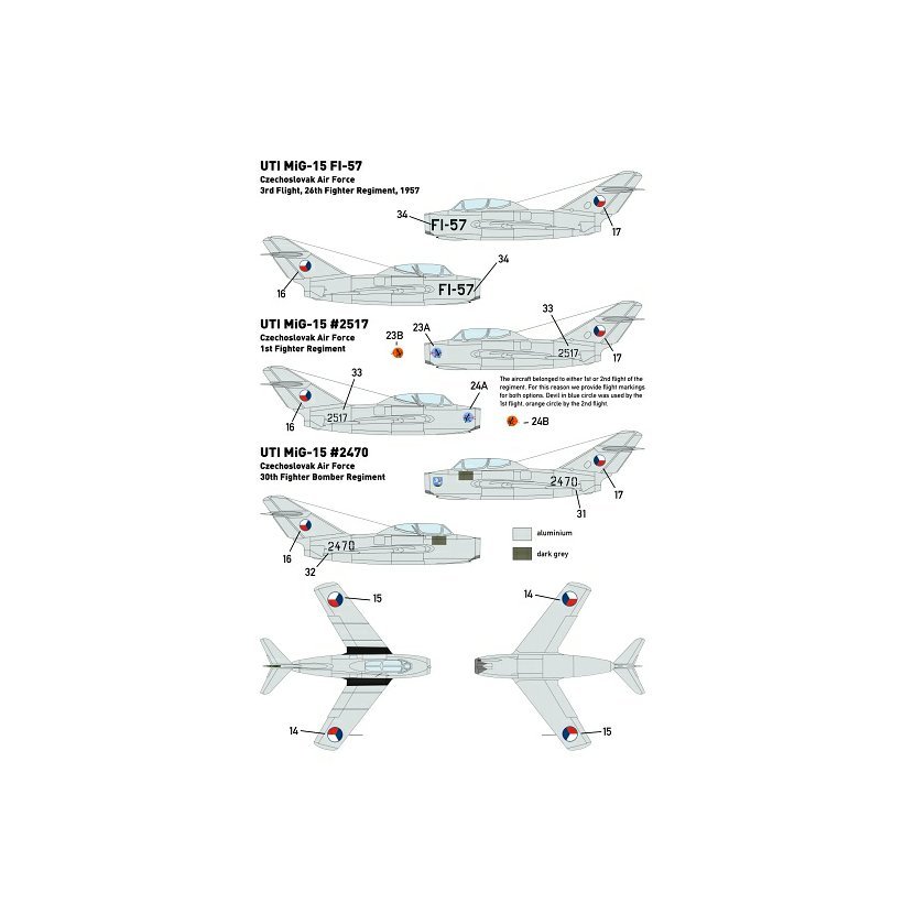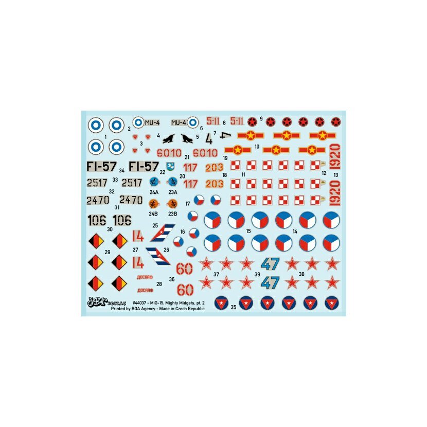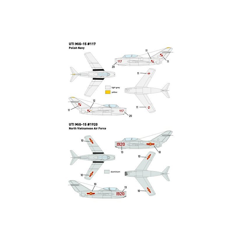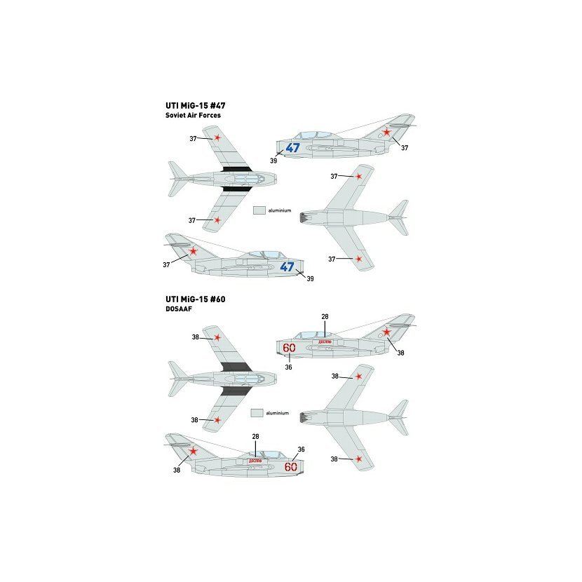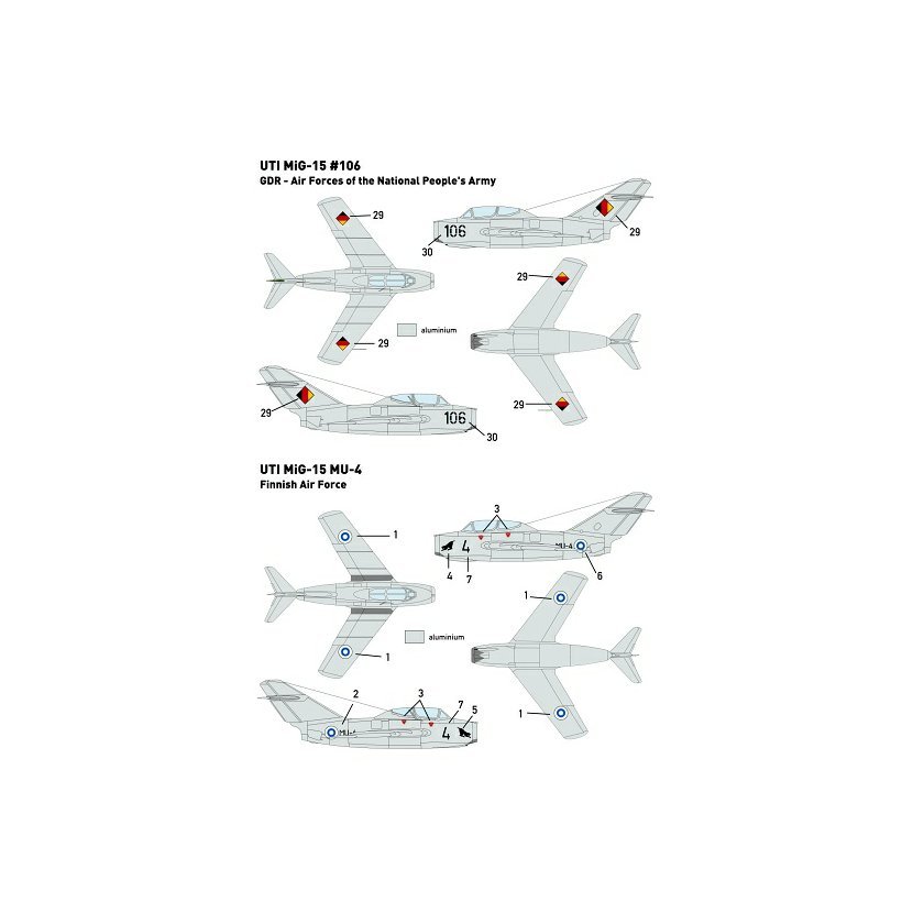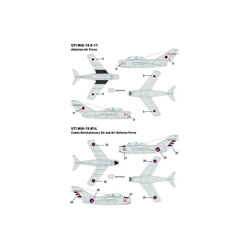 Obtisková sada pro stavebnici MiG-15UTI. Obsahuje obtisky pro 13 letounů z Československa, Polska, NDR, Sovětského svazu, Albánie, Kuby a Finska.