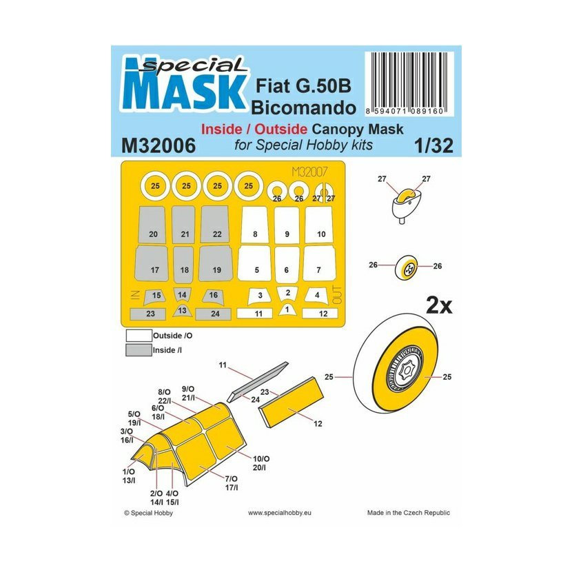Národnost: chorvatská, italská, německá Předřezané stříkací masky určené pro zamaskování čirých dílů a kol podvozku modelu Fiat G.50B Bicomando.