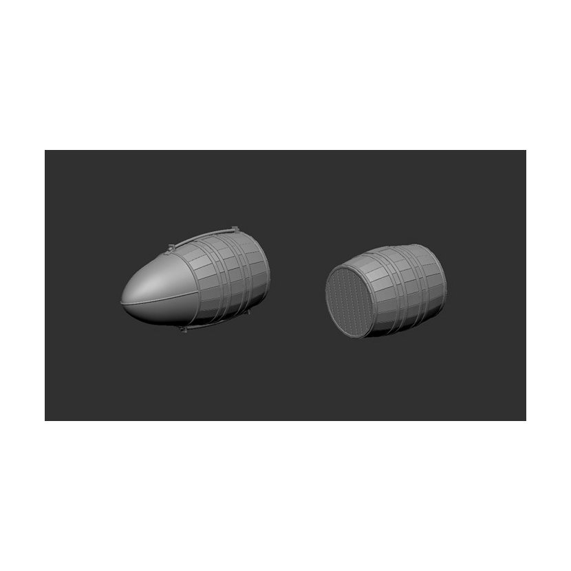Sada pivních sudů pro Spitfire Mk.IXC Sada obsahuje: 2 ks pivních sudů 2 ks pivních sudů s aerodynamickým krytem