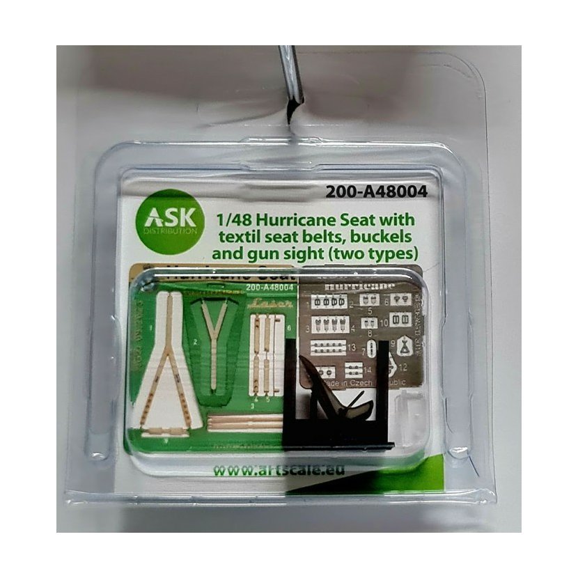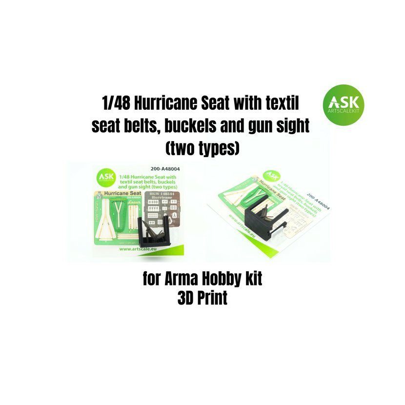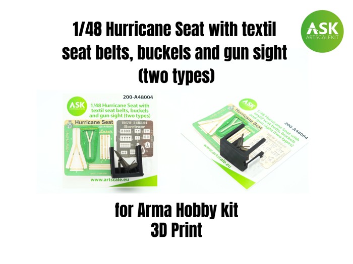Velmi kvalitní tisk sedadla, dvou různých průhledných mířidel, textilních bezpečnostních pásů a fotoleptaných přezek s kooperací HGW Model pro 1/48 Hawker Hurricane. Doporučená stavebnice Arma Hobby, lze ale také použít pro plastikovou stavebnici jiného výrobce.