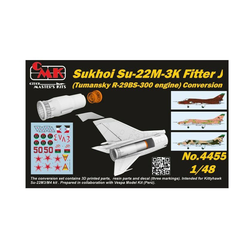 Letouny řady Sukhoi Su-17/22 byly vyráběny se dvěma typy motorů. Do letadel byly montovány motory Lyulka verzí AL-7F-1 a AL-21F-3 nebo rozměrově odlišné motory Tumansky R-29BS-300. Model firmy Kitty Hawk obsahuje díly trupu pouze pro motor AL-21F-3. Proto jsme ve spolupráci s peruánskou firmou Vespa Model Kit připravili konverzní set zadní části trupu a svislé ocasní plochy pro verzi Su-22M-3K Fitter J s motorem Tumansky R-29BS-300. Set obsahuje obtisky pro ruský, libyjský a jihojemenský stroj.