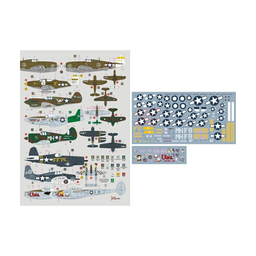 1/P-47D Thunderbolt, Lt. Col. R.R. Rowland, 341st FS, 348th FG, New Guinea 1943 2/ P-39N Airacobra 42-18812, Lt. E.W. Kyro, 41st FS, 35th FG, New Guinea 1943 3/ P-40E Warhawk, Capt. B.S. Irvin, 9th FS, 49th FG, Australia 1942 4/ P-51D Mustang, Lt. R.S. Gardner, 457th FS, 506th FG, Iwojima 1945 5/ CA-13 Boomerang A46-147, No. 83 Sqn RAAF, 1944 6/ FG-1D Corsair, Lt. D.K. Yost, VMF-351, USS Cape Gloucester 1945 7/ FM-2 Wildcat, Ens. D.C. Bennett, VC-10, USS Gambier Bay 1944 8/ P-38L Lightning, Lt. Col. C. Tice Jr., HQ 49th FG, Philippines 1945