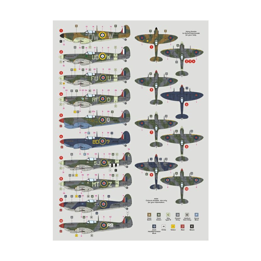 1/ Spitfire Mk.I R6993, S/L J. Ellis, No.610 Sqn, 1940 2/ Spitfire Mk.VB AB972, F/L B.E.F. Finucane, No.452 Sqn RAAF, 1941 3/ Spitfire Mk.VB EN824, F/L J.W. Yarra, No.453 Sqn RAAF, 1942 4/ Spitfire Mk.VB EN951, D/L J. Zumbach, No.303 Sqn, 1942 5/ Spitfire Mk.VC JK116, S/L J.F. Edwards, No.274 Sqn, Italy 1944 6/ Spitfire Mk.VC JK228, W/C B. Drake, Krendi Wing, Malta 1943 7/ Spitfire Mk.IXC ML214, S/L J. Plagis, No.126 Sqn, 1944 8/ Spitfire Mk.IXC EN473, S/L D.E. Kingaby, No.122 Sqn, 1943 9/ Spitfire Mk.IXC EN530, W/C C.F. Gray, No.322 Wing, Sicily 1943 10/ Spitfire Mk.VIII MT685, W/C R.E. Barry, No.244 Wing, Italy 1945