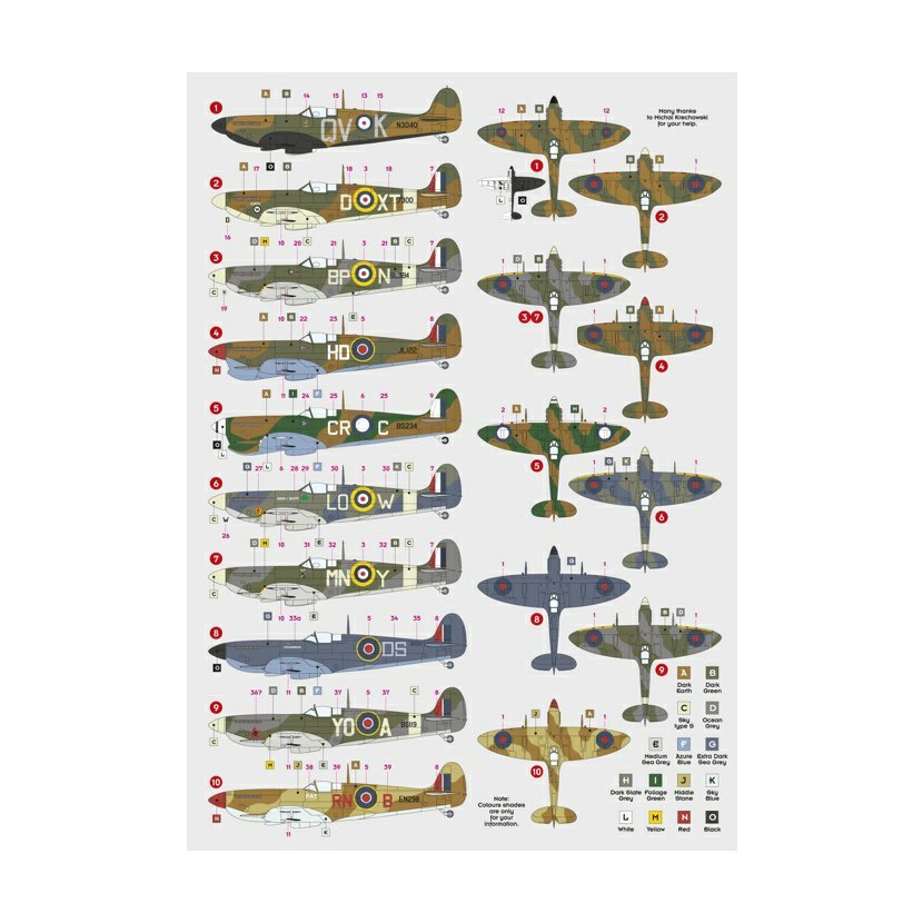 1/ Spitfire Mk.I N3040, F/L B. Lane, No.19 Sqn, 1940 2/ Spitfire Mk.VA R7300, F/O F. Scott-Malden, No.603 Sqn, 1941 3/ Spitfire Mk.VB BL384, F/L J. Gibson, No.457 Sqn RAAF, 1942 4/ Spitfire Mk.VC JL122, W/C H. Dundas, No.324 Wing, Italy 1943 5/ Spitfire Mk.VC BS234, W/C C. Caldwell, No.1 Wing RAAF, Australia 1943 6/ Spitfire Mk.VB BM124, S/L B. Finucane, No.602 Sqn, 1942 7/ Spitfire Mk.VB BL540, F/L Du Monceau-De Bergendal, No.350 Sqn 8/ Spitfire Mk.IXC JK650, W/C W. Duncan-Smith, Luqa Wing, Malta 1943 9/ Spitfire Mk.IXC BS119, P/O D. Morrison, No.401 Sqn, 1942 10/ Spitfire Mk.IXC EN298, F/L D. Cox, No.72 Sqn, Algeria 1943