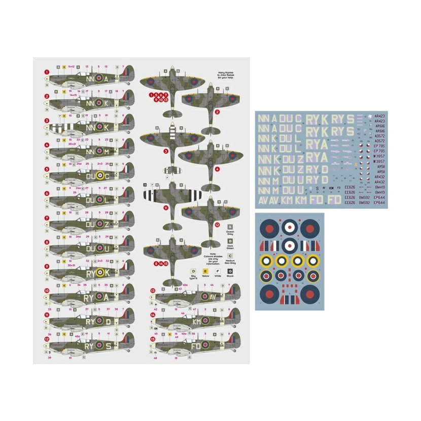 1/ Spitfire Mk.VB AR423, F/Sgt F. Vaculík, No.310 Sqn RAF 2/ Spitfire Mk.VB BM121, F/L V. Raba, No.310 Sqn RAF 3/ Spitfire Mk.VB, No.310 Sqn RAF 4/ Spitfire Mk.VC AR616, F/O K. Zouhar, No.310 Sqn RAF 5/ Spitfire Mk.VB AD572, F/O F. Peřina, No.312 Sqn RAF 6/ Spitfire Mk.VB EP785, F/O L. Světlík, No.312 Sqn RAF 7/ Spitfire Mk.VB W3957, F/O F. Chábera, No.312 Sqn RAF 8/ Spitfire Mk.VC AR511, No.312 Sqn RAF 9/ Spitfire Mk.VB AR432, F/O J. Kučera, No.313 Sqn RAF 10/ Spitfire Mk.VB BM419, S/L K. Mrázek, No.313 Sqn RAF 11/ Spitfire Mk.VB BL767, P/O J. Pípa, No.313 Sqn RAF 12/ Spitfire Mk.VB EP644, F/L J. Muzika, No.313 Sqn RAF 13/ Spitfire Mk.VB BM592, W/C A. Vašátko, Exeter Wing 1942 14/ Spitfire Mk.VC EE626, W/C K. Mrázek, Exeter Wing 1942 15/ Spitfire Mk.VC EE626, W/C F. Doležal, Exeter Wing 1943