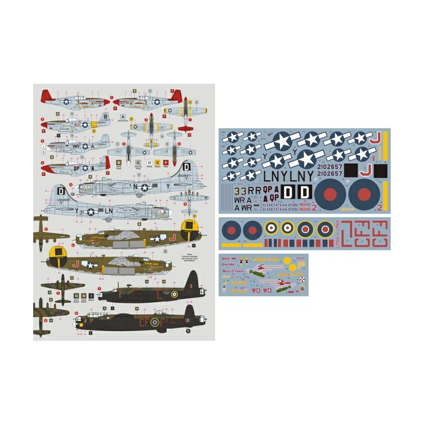 1/ P-51B Mustang 42-103454, pilot Lt. A.L. Young, 100th FS, 332nd FG, 15th AF 2/ P-51D-5 Mustang 44-13487, pilot Lt. K.M. Max, 4th FS, 52nd FG, 15th AF 3/ P-51D Mustang 44-73144, pilot Lt.Col. C.H. Kinnard, 354th FS, 355th FG, 8th AF 4/ P-51D Mustang 44-72251, pilot Lt.Col. S.S. Woods, 336th FS, 4th FG, 8th AF 5/ B-17G Flying Fortress 42-102657, 350th BS, 100th BG, 8th AF 6/ B-24H Liberator 42-52479, 776th BS, 464th BG, 15th AF 7/ Wellington Mk.X LP204, No.150 Sqn RAF 8/ Lancaster Mk.I NG240, No.625 Sqn RAF