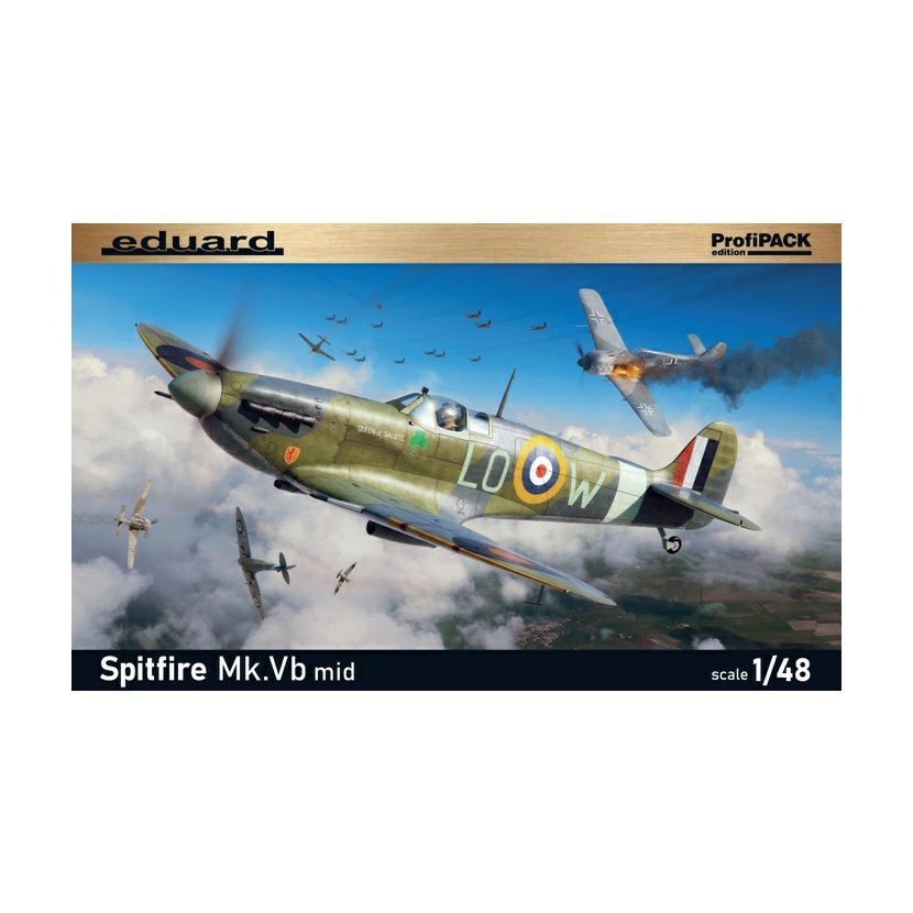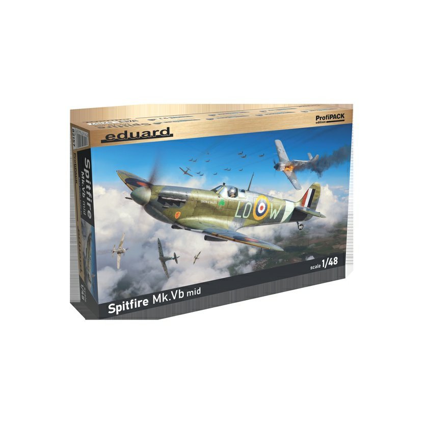Stavebnice britského druhoválečného stíhacího letounu Spitfire Mk.Vb v měřítku 1/48; edice ProfiPACK. Všechny Spitfiry jsou v tzv. středním provedení s pancéřovým štítkem před čelním štítkem a asymetrickými boulemi pod dolní polovinou křídla. Plastové díly: Eduard-kamufláže: 7