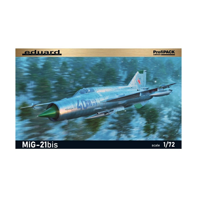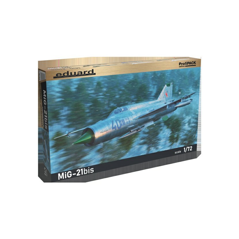 Stavebnice sovětského proudového letounu MiG-21bis v měřítku 1/72; edice ProfiPACK. Stavebnice nabízí 6 markingů letadel použitých v letectvech různých zemí celého světa. plastové díly: Eduard- počet kamuflážních schémat: 6- obtisky: Eduard- leptané díly: ano, barvené- maska: ano