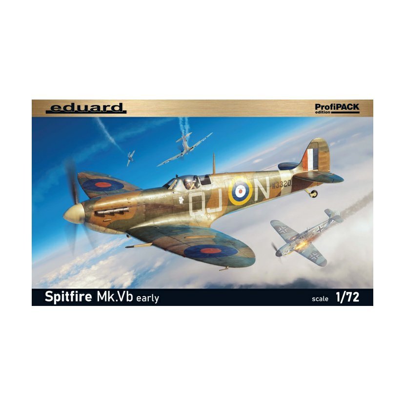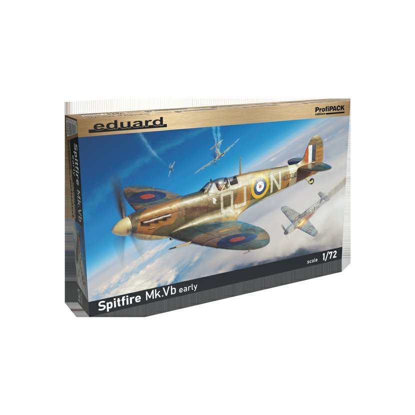 Stavebnice britského druhoválečného stíhacího letounu Spitfire Mk.Vb v měřítku 1/72; edice ProfiPACK. Všechny Spitfiry jsou v tzv. raném provedení s pancéřovým štítkem před čelním štítkem a symetrickými boulemi pod dolní polovinou křídla. Plastové díly: Eduard - kamufláže: 6
