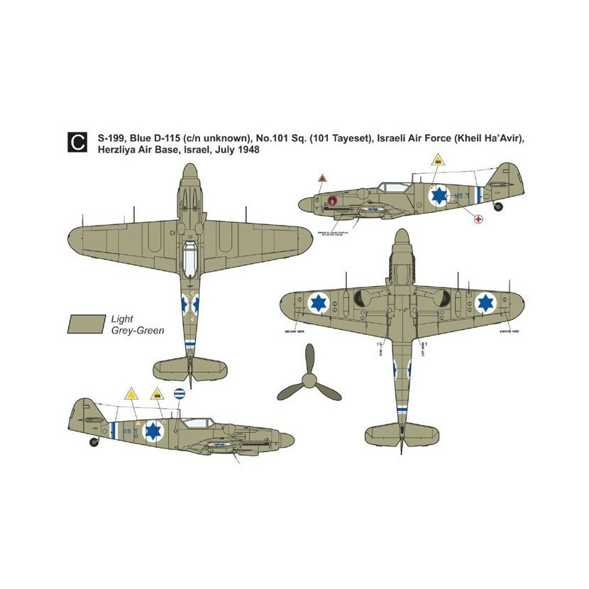 S-199, modrá D-115 (neznámé výr. č.), 101. peruť (tajeset), izraelské vojenské letectvo (Kheil Ha'Avir), základna Herclija, Izrael, červenec 1948
