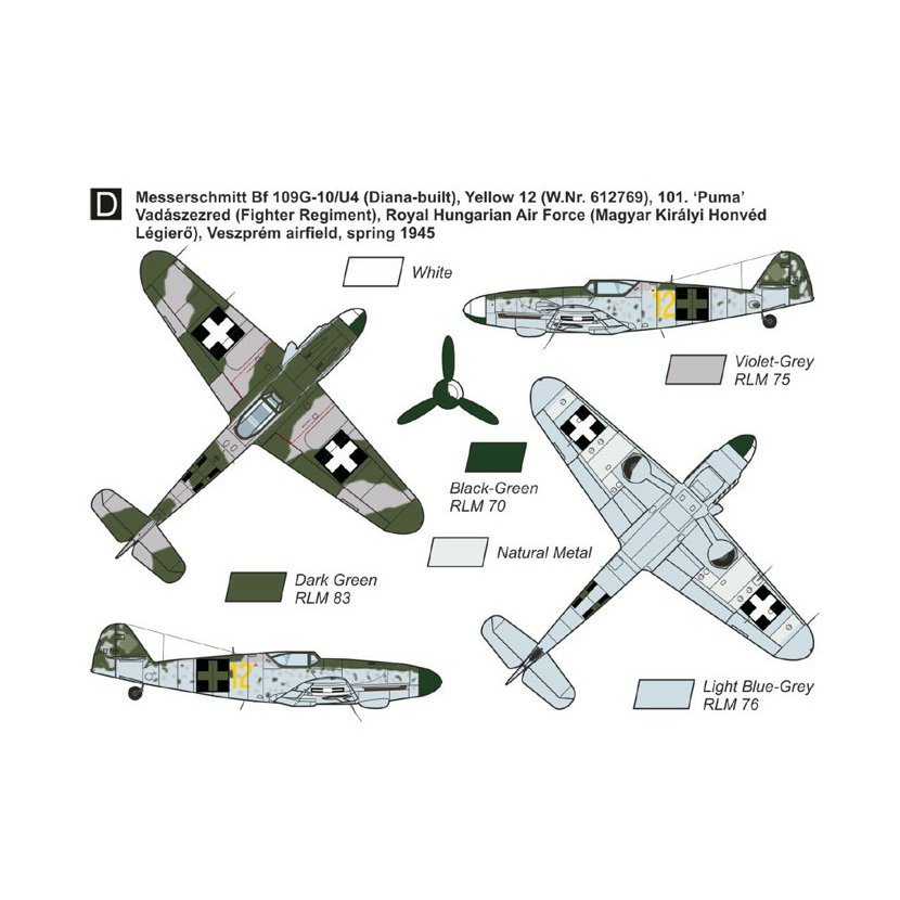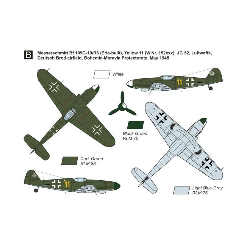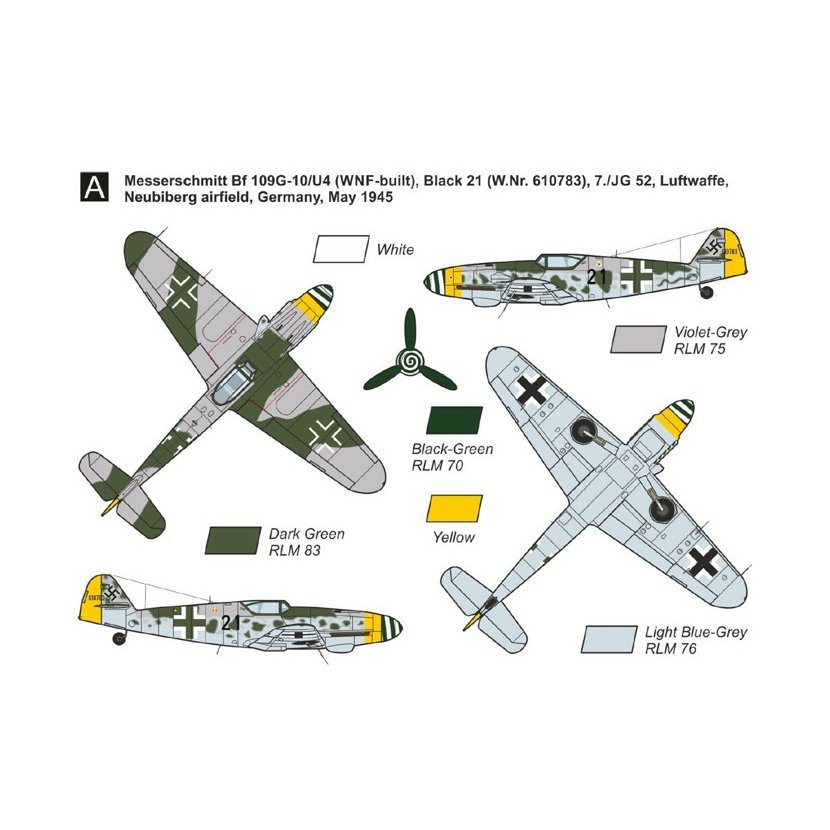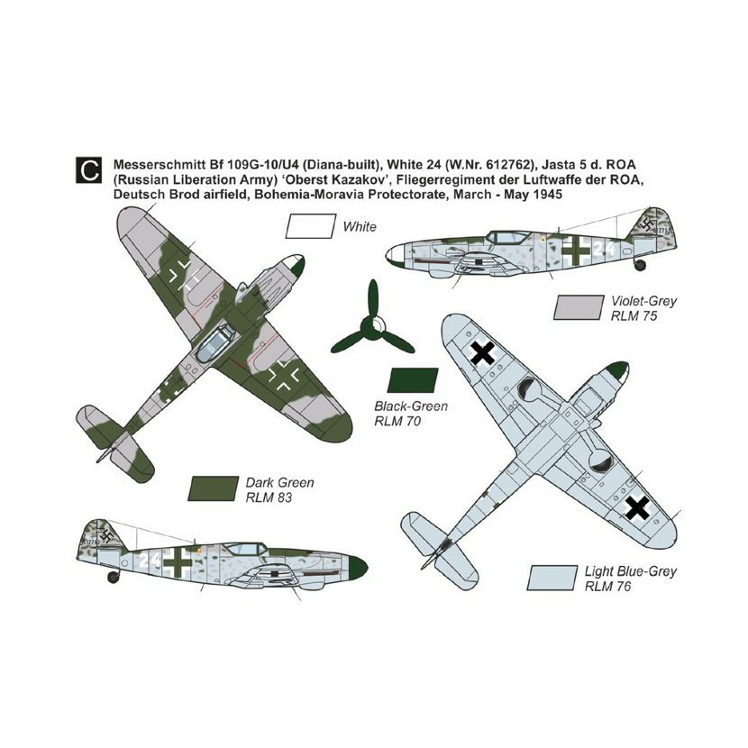 NEW 2025 MOULDS Stavebnice obsahuje 2 kompletní modely a obtisky pro 4 varianty: Messerschmitt Bf 109G-10/U4 (vyrobený WNF), černý 21 (W.Nr. 610783), 7./JG 52, Luftwaffe, letiště Neubiberg, Německo, květen 1945 Messerschmitt Bf 109G-10/R6 (vyrobený v Erle), žlutý 11 (W.Nr. 152xxx), JG 52, Luftwaffe, letiště Deutsch Brod, Protektorát Čechy, květen 1945 Messerschmitt Bf 109G-10/U4 (vyrobený Dianou), White 24 (W.Nr. 612762), Jasta 5 d. ROA (Ruská osvobozenecká armáda) 'Oberst Kazakov', Fliegerregiment der Luftwaffe der ROA, letiště Deutsch Brod, Protektorát Protektorát Protektorát Protektorát, březen – květen 1945 Messerschmitt Bf 109G-10/U4 (postavený Diana), žlutý 12 (W.Nr. 612769), 101. "Puma" Vadászezred (stíhací pluk), Královské letectvo maďarského letectva (Magyar Királyi Honvéd Légierő), letiště Veszprém, jaro 1945
