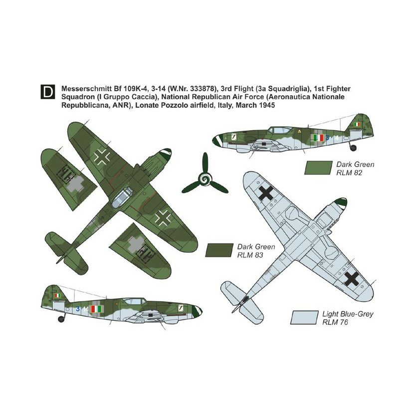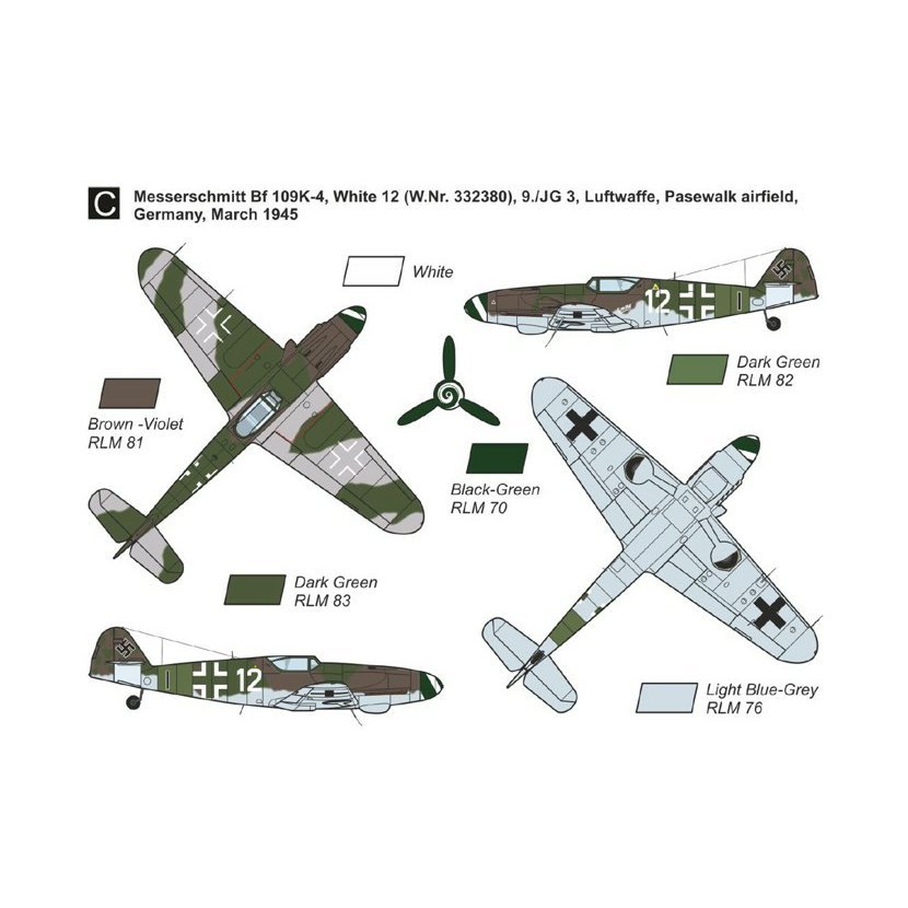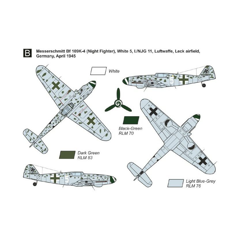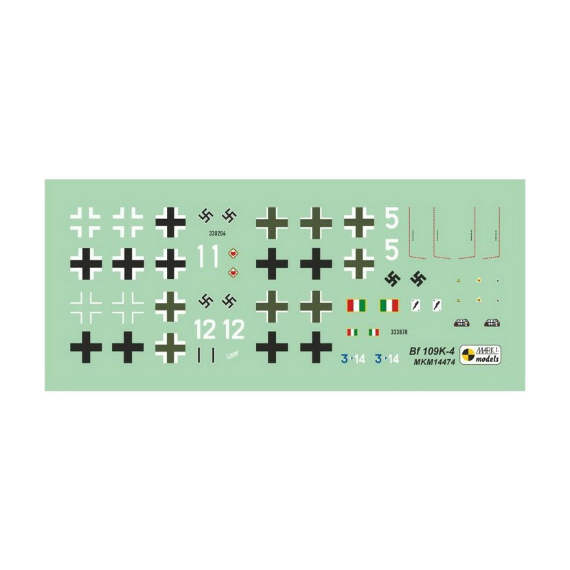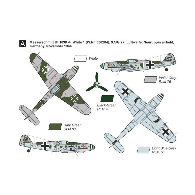NEW 2025 MOULDS Stavebnice obsahuje 2 kompletní modely a obtisky pro 4 varianty Messerschmitt Bf 109K-4, White 1 (W.Nr. 330204), 9./JG 77, Luftwaffe, letiště Neuruppin, Německo, listopad 1944 Messerschmitt Bf 109K-4 (noční stíhač), White 5, I./NJG 11, Luftwaffe, letiště Leck, Německo, duben 1945 Messerschmitt Bf 109K-4, White 12 (W.Nr. 332380), 9./JG 3, Luftwaffe, letiště Pasewalk, Německo, březen 1945 Messerschmitt Bf 109K-4, 3–14 (W.Nr. 333878), 3. letka (3a Squadriglia), 1. stíhací peruť (I Gruppo Caccia), Národní republikánské letectvo (Aeronautica Nazionale Repubblicana, ANR), letiště Lonate Pozzolo, Itálie, březen 1945