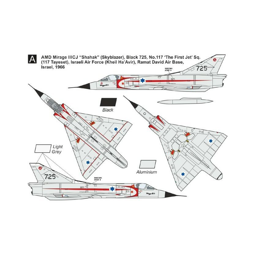 AMD Mirage IIICJ „Šahak“ (Nebeský záblesk), černá 725, 117. peruť (tajeset) , Ha’Silon Ha’Rishona‘ (První proudová), izraelské vojenské letectvo (Kheil Ha'Avir), základna Ramat David, Izrael, 1966