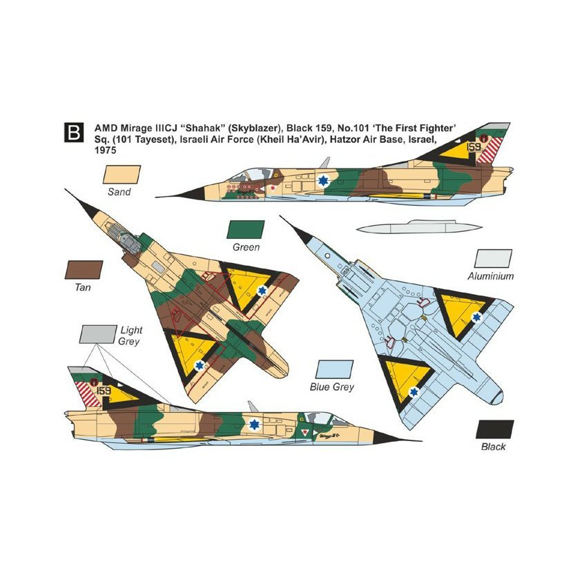 AMD Mirage IIICJ „Šahak“ (Nebeský záblesk), černá 159, 101. peruť (tajeset) ,Hakrav Ha’Rishona‘ (První stíhací), izraelské vojenské letectvo (Kheil Ha'Avir), základna Hatzor, Izrael, 1975