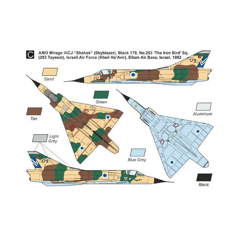 AMD Mirage IIICJ „Šahak“ (Nebeský záblesk), černá 179, 253. peruť (tajeset) ,Ha’Tsipor Barzel‘ (Ocelový pták), izraelské vojenské letectvo (Kheil Ha'Avir), základna Eitam, Izrael, 1982
