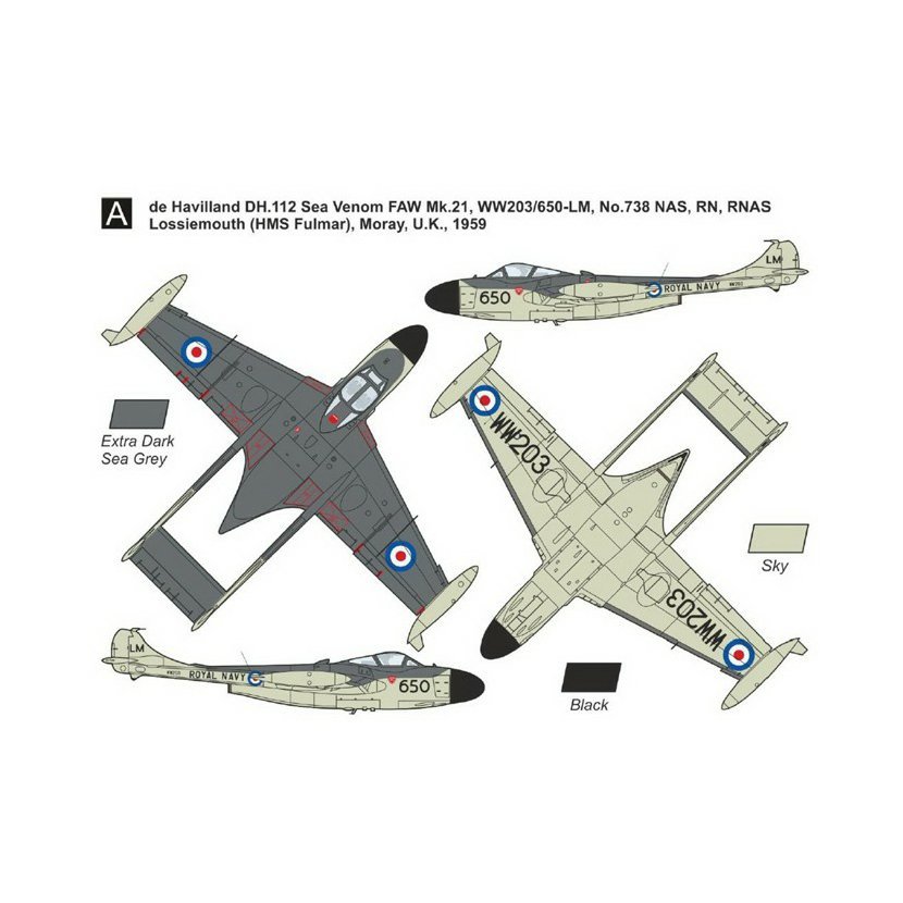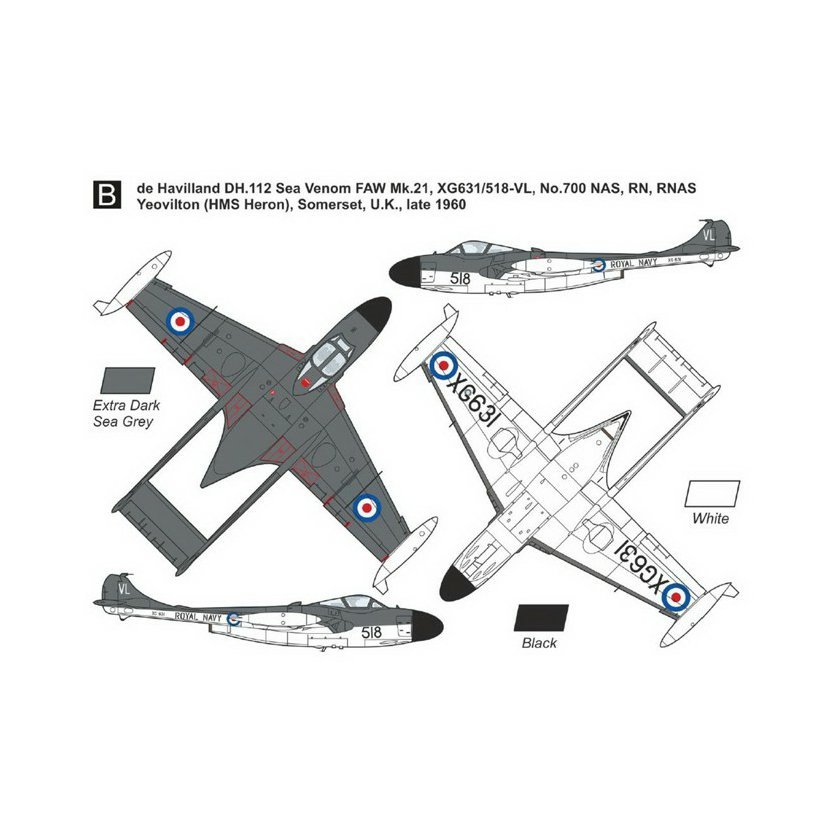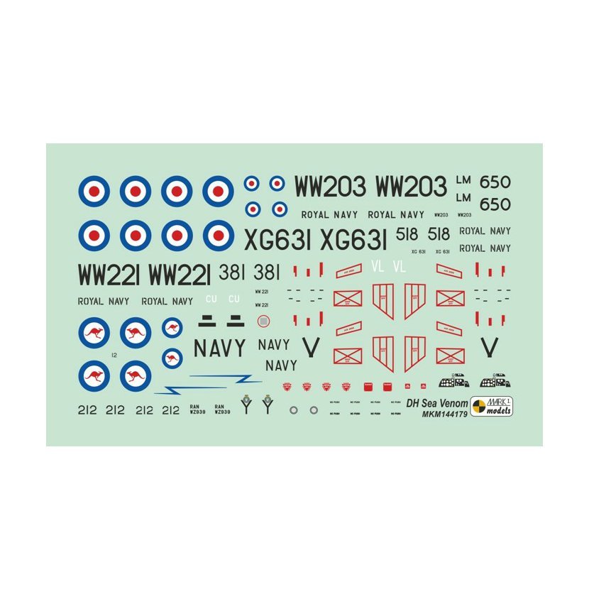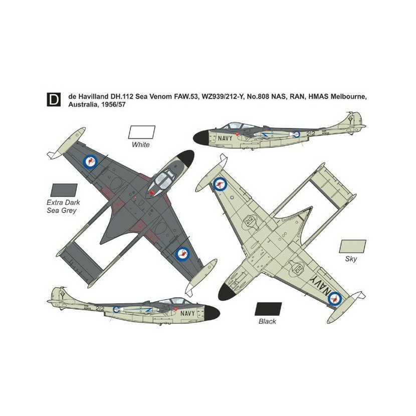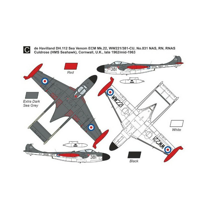 Stavebnice obsahuje 2 komletní modely a obtisky pro 4 varianty: de Havilland DH.112 Sea Venom FAW Mk.21, WW203/650-LM, No.738 NAS, RN, RNAS Lossiemouth (HMS Fulmar), Moray, Velká Británie, 1959 de Havilland DH.112 Sea Venom FAW Mk.21, XG631/518-VL, No.700 NAS, RN, RNAS Yeovilton (HMS Heron), Somerset, Velká Británie, konec roku 1960 de Havilland DH.112 Sea Venom ECM Mk.22, WW221/381-CU, No.831 NAS, RN, RNAS Culdrose (HMS Seahawk), Cornwall, Velká Británie, konec roku 1962/polovina roku 1963 de Havilland DH.112 Sea Venom FAW.53, WZ939/212-Y, No.808 NAS, RAN, HMAS Melbourne, Austrálie, 1956/57