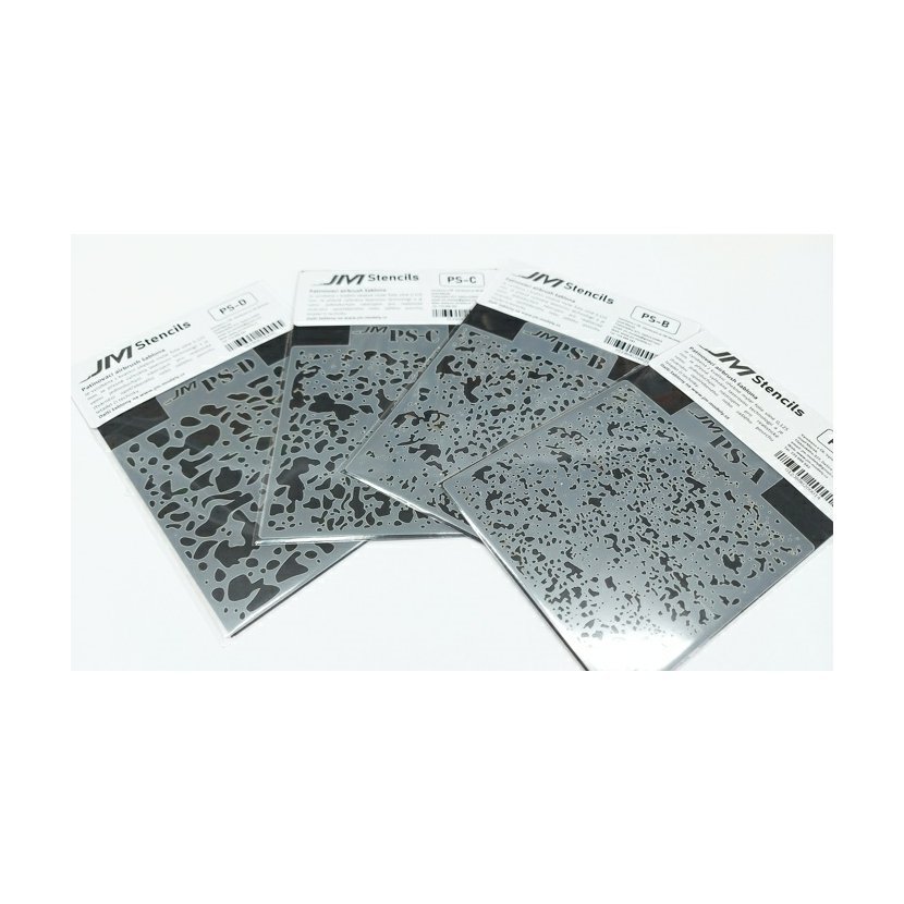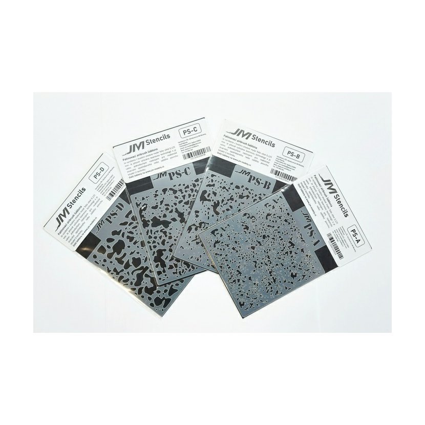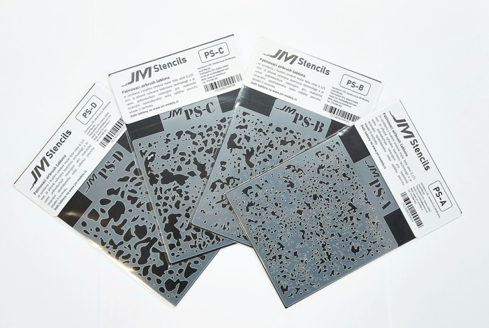 Cenově výhodný set 4ks stříkacích patinovacích šablon z kvalitní 0,125mm silné plastové folie pro dokonalé provedení zašlého povrchu letadla, nebo vojenské techniky. Je přesně vyřezána laserovou technologií.