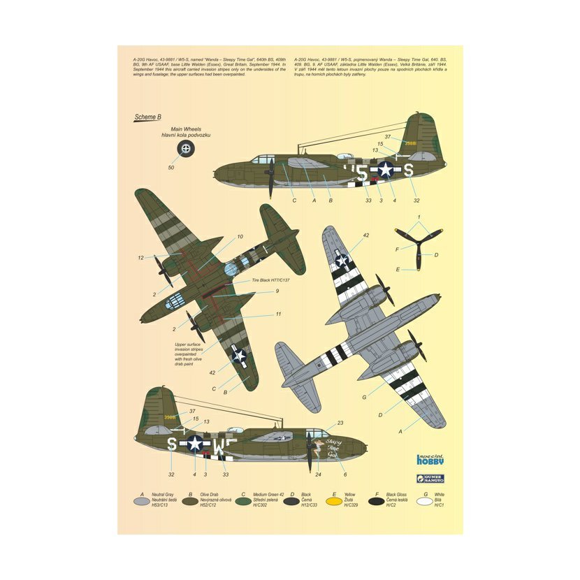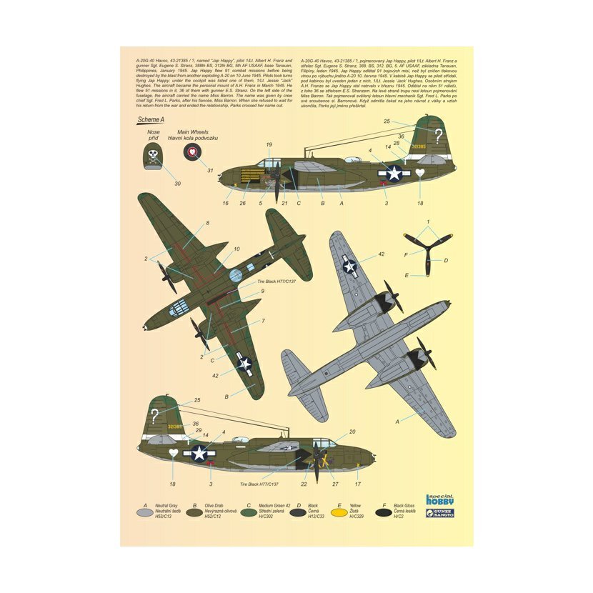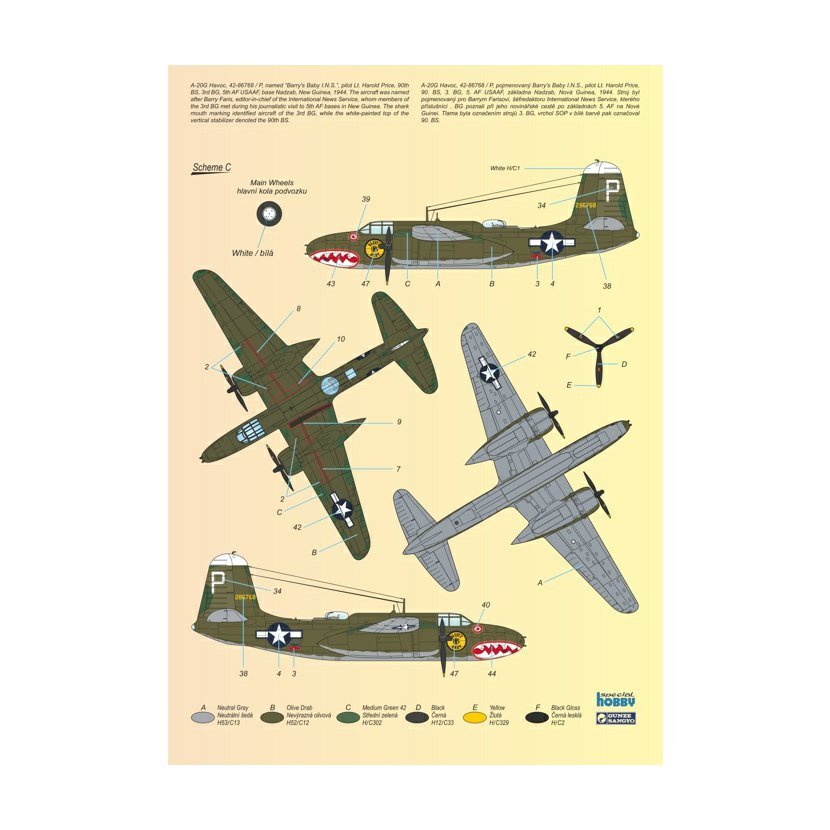 Americké dvoumotorové bombardéry A-20 Havoc / Boston byly nasazeny na mnoha bojištích druhé světové války. Byly velmi úspěšné v pacifické oblasti. Verze A-20G byla vybavena přídí s baterií velkorážných kulometů, zadní polosféru střežila střelecká věž s dvojicí kulometů stejné ráže. Tato výzbroj se uplatnila při hloubkových útocích, stejně jako bomby svrhávané z malé výšky. Kromě amerických byly v Pacifiku nasazeny i Bostony RAAF. Australské Bostony pořádaly oblíbené bombové ‘tea party’. V Evropě operovaly A-20G ze základen v Itálii a Velké Británii v roli taktických bombardérů ve velkých formacích. Většinou je vedly A-20K s prosklenou přídí se zaměřovačem Norden. Po invazi do Evropy operovaly A-20G i z francouzských základen. To se týká i jednoho ze strojů, který nabízí naše stavebnice. Stroj s invazními pruhy byl ozdoben kresbou krásky dle Vargase. Další tři stroje operovaly v Pacifiku. Dva americké byly ozdobeny nose arty, jeden navíc s tlamou na přídi. Poslední stroj létal u No.22 Sqn. RAAF.